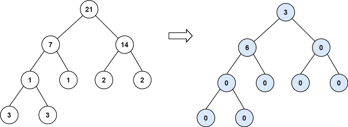 Input: root = [21,7,14,1,1,2,2,3,3] Output: 9