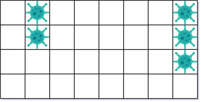 Input: isInfected = [[0,1,0,0,0,0,0,1],[0,1,0,0,0,0,0,1],[0,0,0,0,0,0,0,1],[0,0,0,0,0,0,0,0]] Output: 10 Explanation: There are 2 contaminated regions. On the first day, add 5 walls to quarantine the viral region on the left. The board after the virus spreads is:On the second day, add 5 walls to quarantine the viral region on the right. The virus is fully contained.