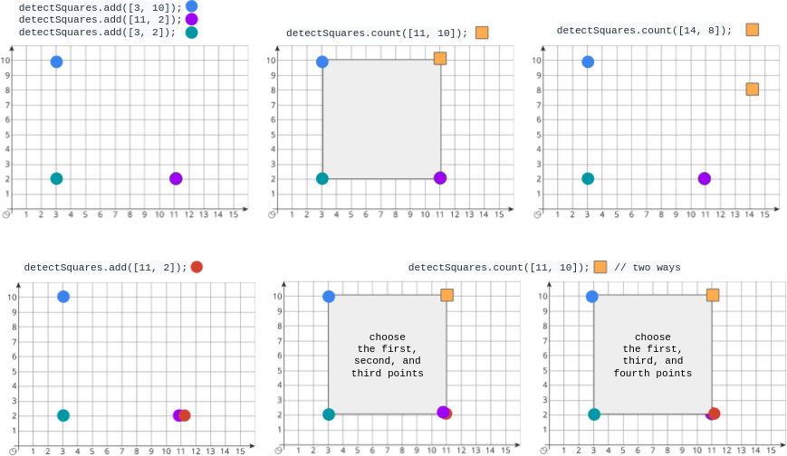 detectSquares.add([11, 2]); // Adding duplicate points is allowed.