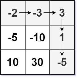 Input: dungeon = [[-2,-3,3],[-5,-10,1],[10,30,-5]] Output: 7 Explanation: The initial health of the knight must be at least 7 if he follows the optimal path: RIGHT-> RIGHT -> DOWN -> DOWN.