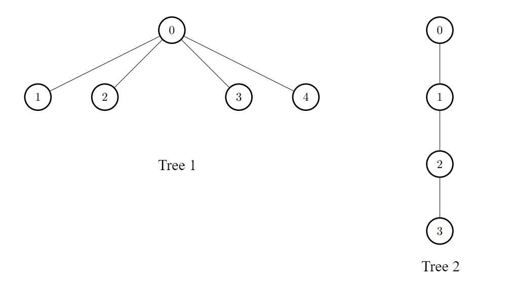 i = 0, connect node 0 from the first tree to node 0 from the second tree.i = 1, connect node 1 from the first tree to node 0 from the second tree.i = 2, connect node 2 from the first tree to node 4 from the second tree.i = 3, connect node 3 from the first tree to node 4 from the second tree.i = 4, connect node 4 from the first tree to node 4 from the second tree.