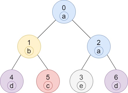 Input: n = 7, edges = [[0,1],[0,2],[1,4],[1,5],[2,3],[2,6]], labels = "abaedcd" Output: [2,1,1,1,1,1,1] Explanation: Node 0 has label 'a' and its sub-tree has node 2 with label 'a' as well, thus the answer is 2. Notice that any node is part of its sub-tree. Node 1 has a label 'b'. The sub-tree of node 1 contains nodes 1,4 and 5, as nodes 4 and 5 have different labels than node 1, the answer is just 1 (the node itself).