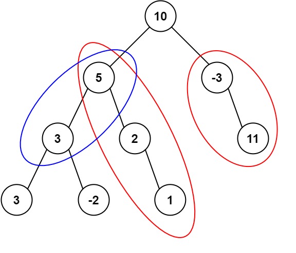 Input: root = [10,5,-3,3,2,null,11,3,-2,null,1], targetSum = 8 Output: 3 Explanation: The paths that sum to 8 are shown.
