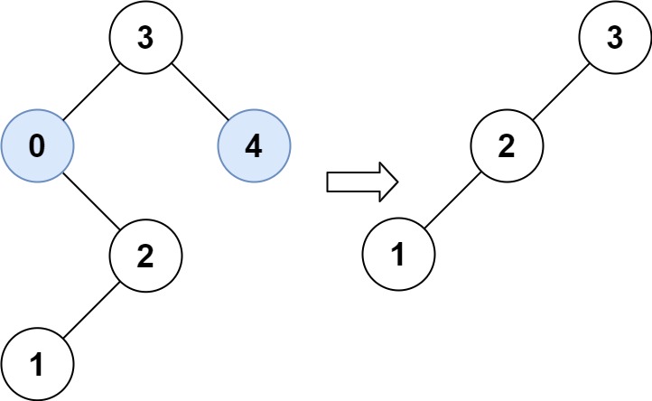 Input: root = [3,0,4,null,2,null,null,1], low = 1, high = 3 Output: [3,2,null,1]